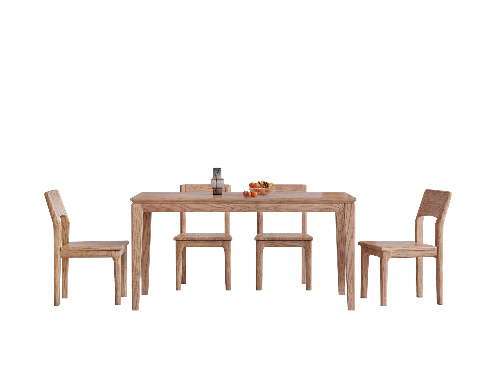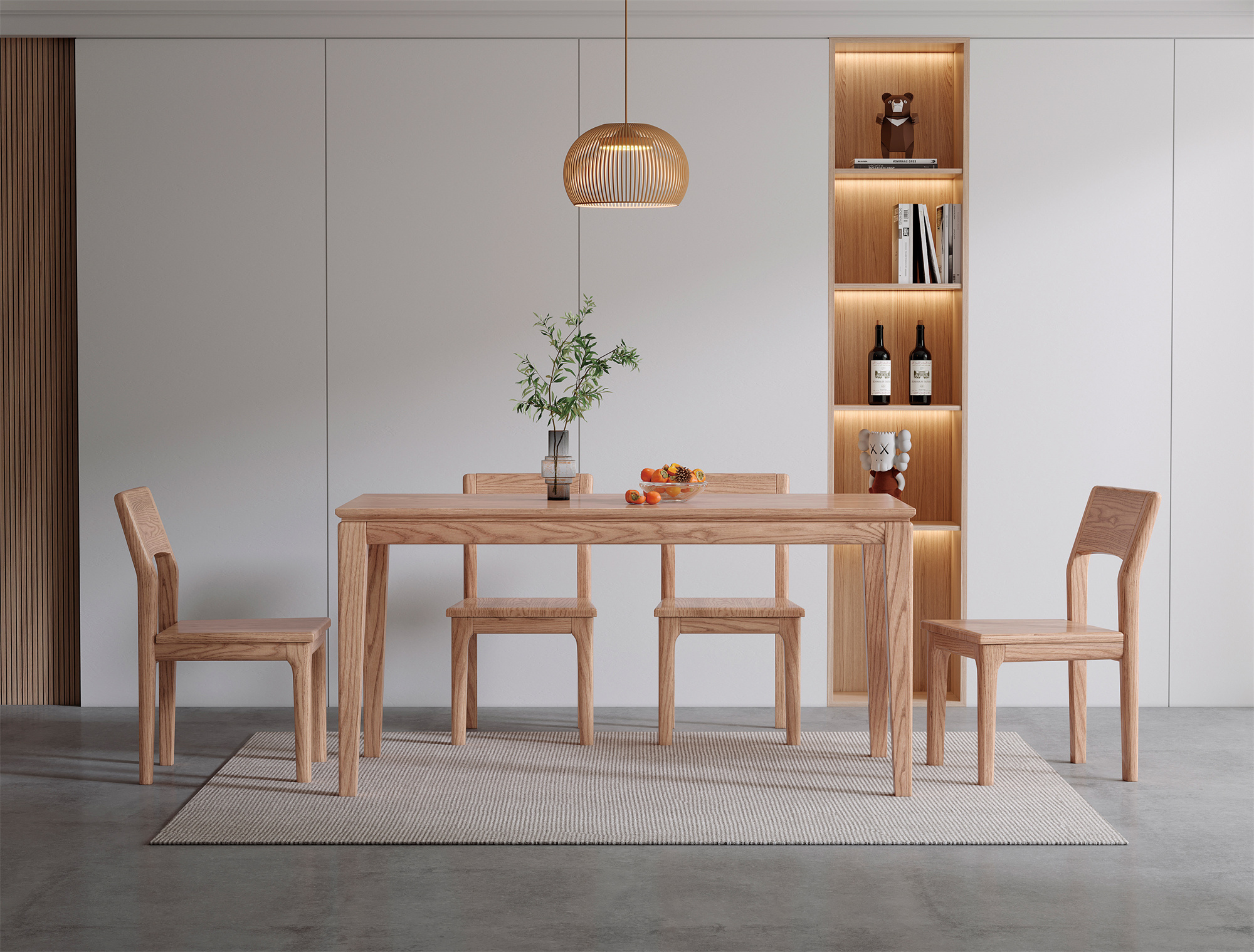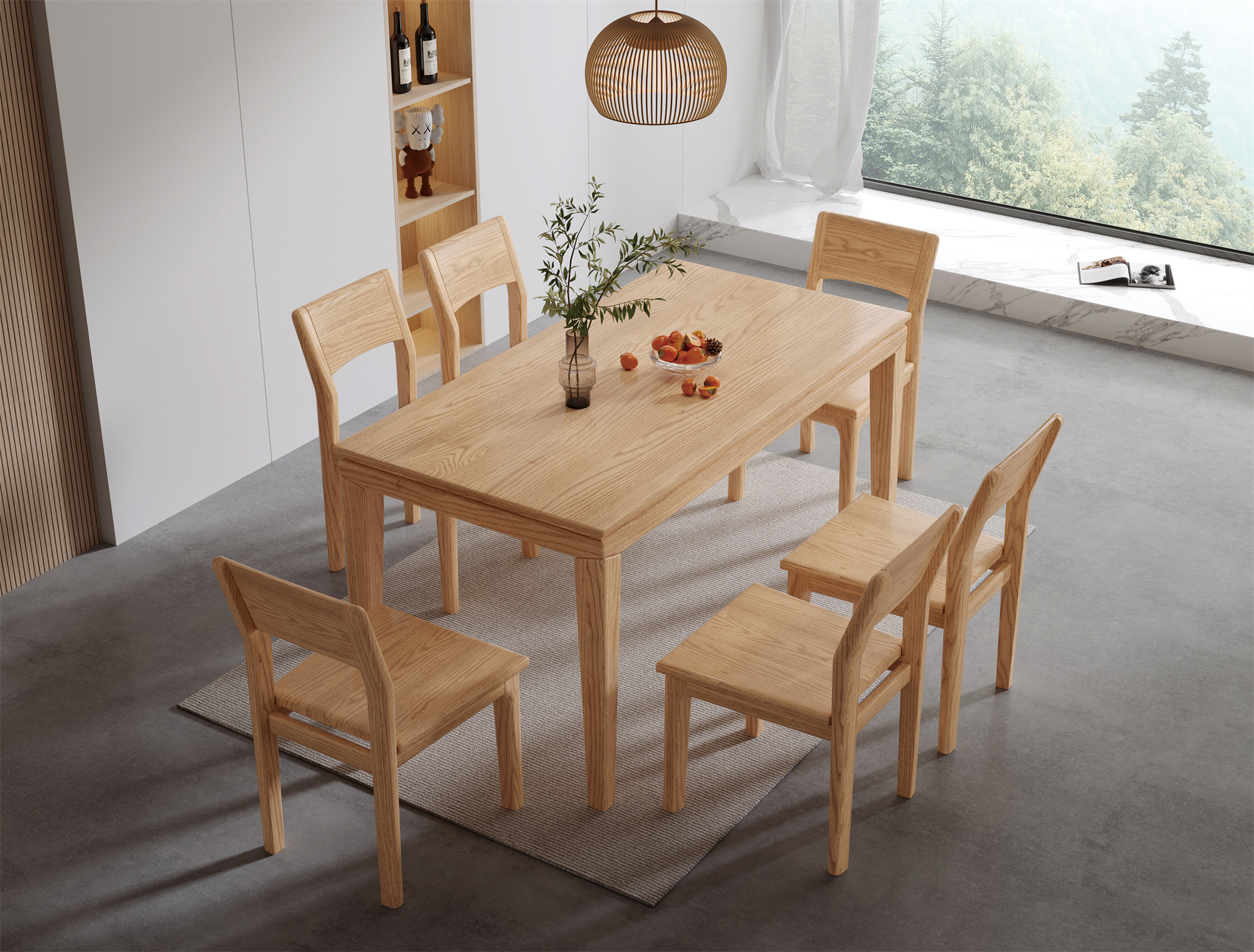 The centerpiece of the set is the long dining table, meticulously constructed from high-quality ash wood. Its sleek lines and smooth surface not only create a modern look but also offer ample space for gatherings and feasts. The natural grain patterns of the wood add a touch of sophistication to any dining area.