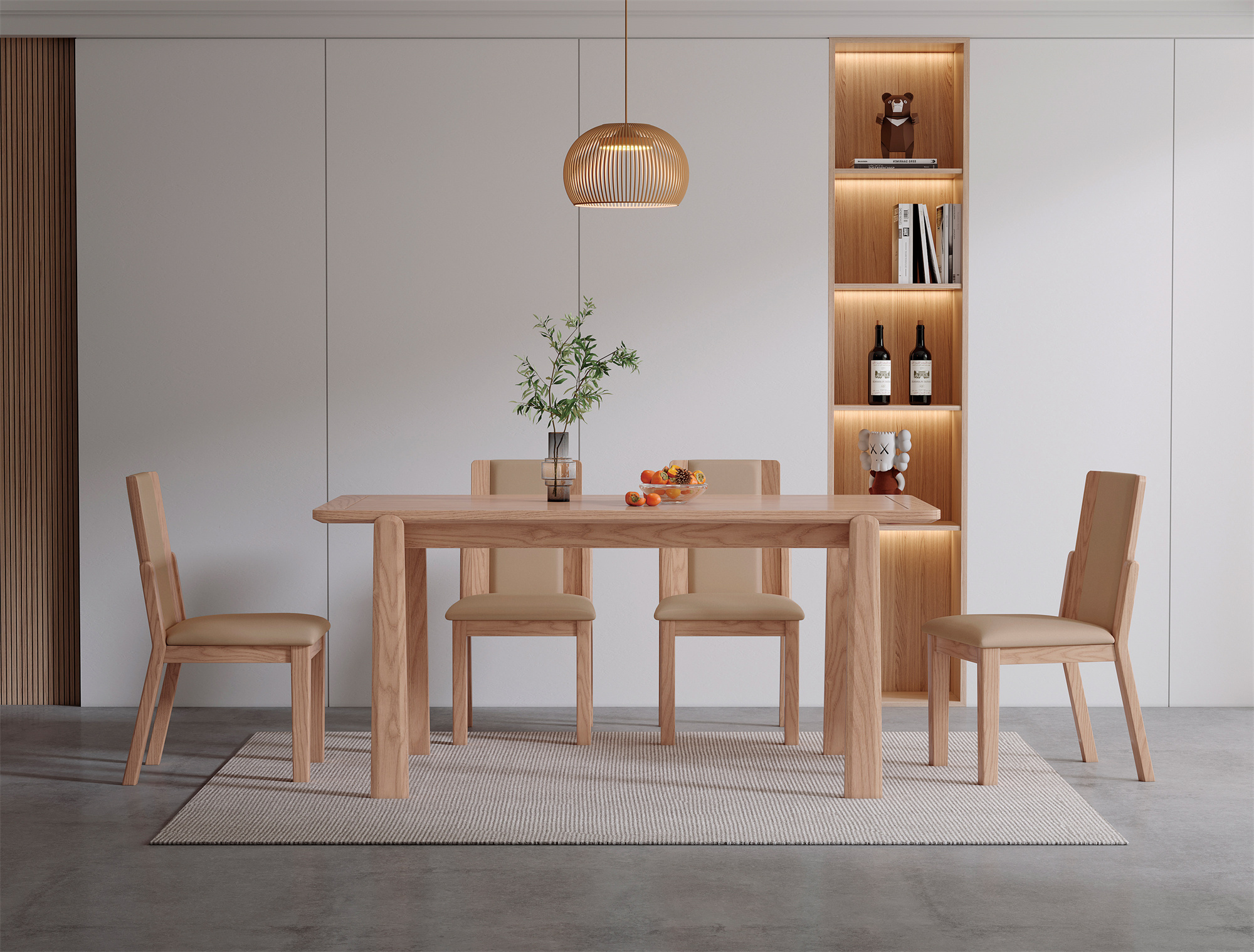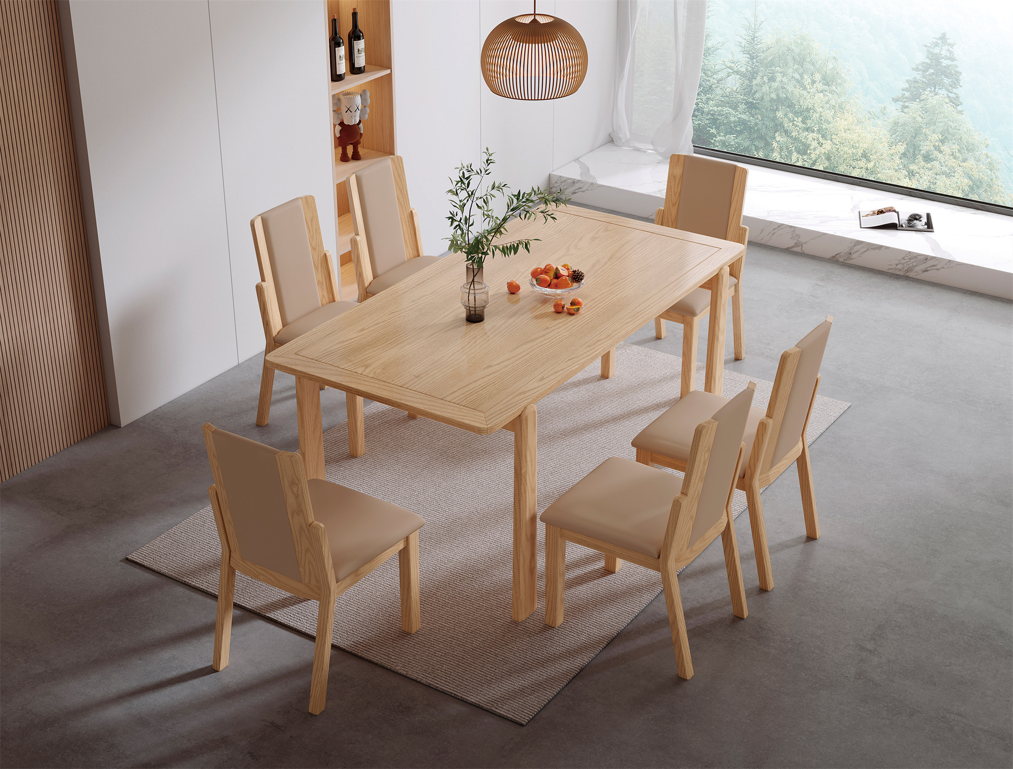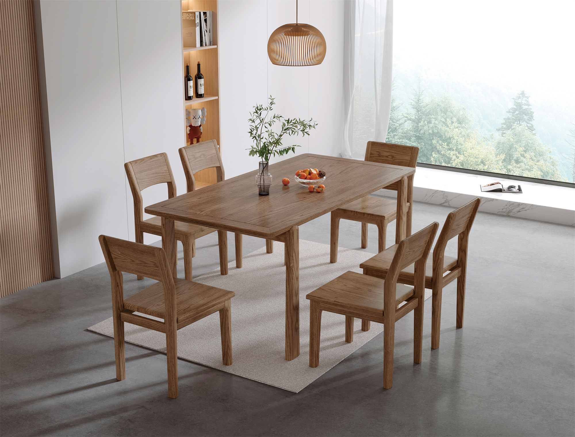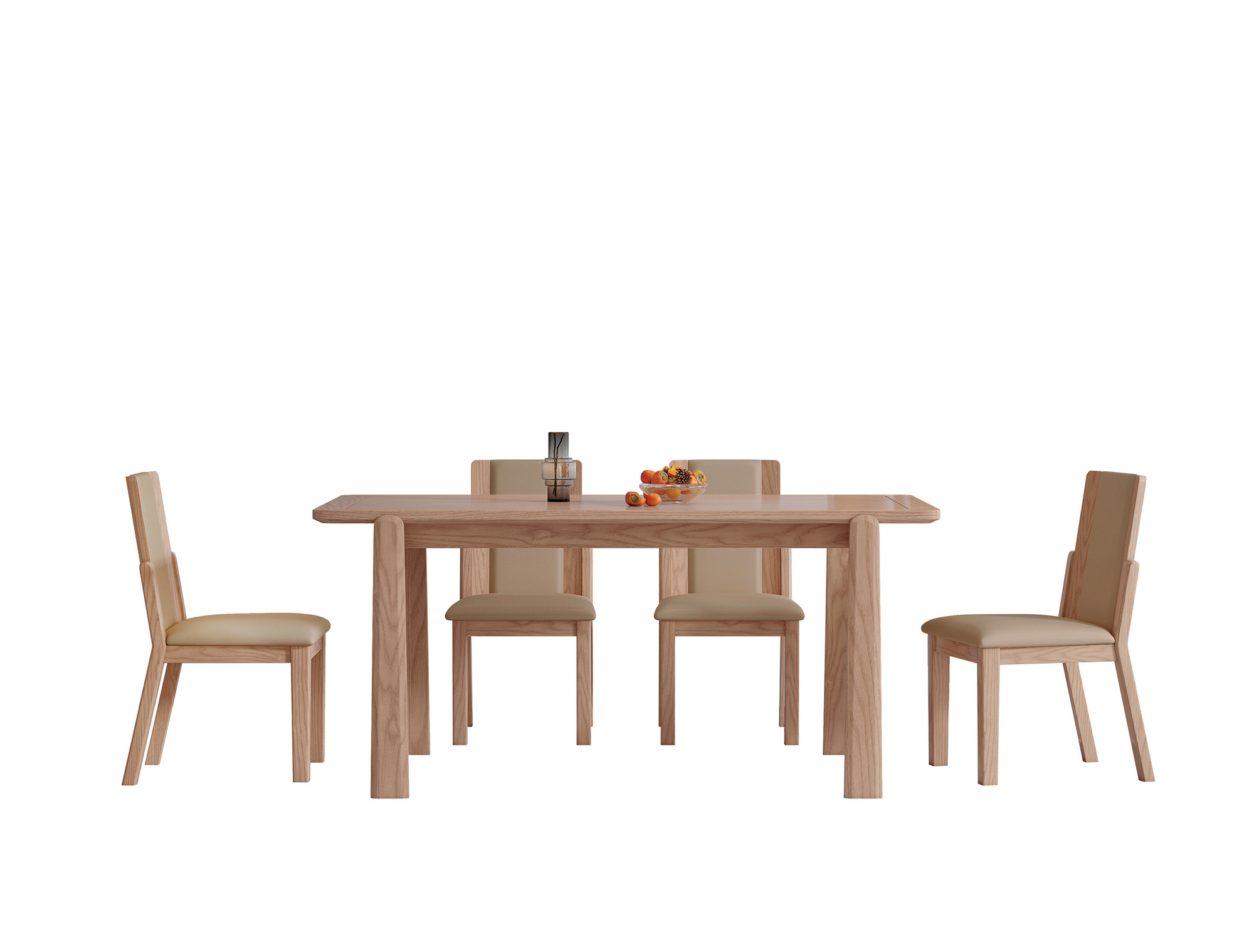 The centerpiece of the set is the long dining table, meticulously constructed from high-quality ash wood. Its sleek lines and smooth surface not only create a modern look but also offer ample space for gatherings and feasts. The natural grain patterns of the wood add a touch of sophistication to any dining area.